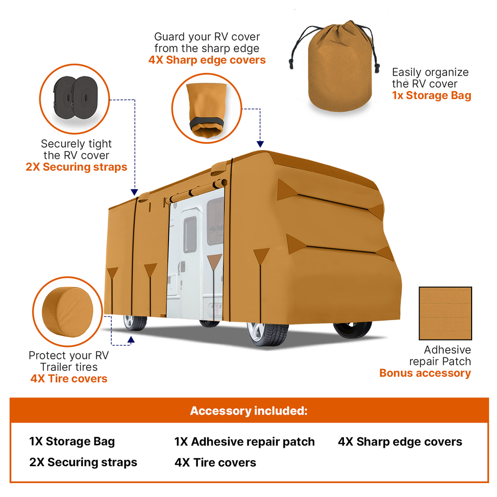 - 【WINDPROOF & SECURE FIT】A total of 8 webbing straps attached to the RV cover provides better protection against the wind. The additional 2 straps are specially designed to better protect the cover from blowing away and tearing in high winds; elastic hem corners, and adjustable front and rear tension plates provide a custom fit.