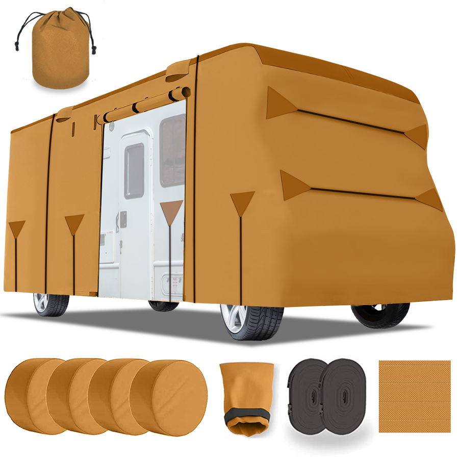 - 【WATERPROOF DURABLE MATERIAL& ANTI-AGING】The Class C RV trailer cover has a reinforced polyester fabric and double stitching. Multiple layers of the top fabric and 3 layers of side fabric are much more tearing-resistant than other covers, protecting your RV from UV damage, dirt, and debris, avoiding environmental hazards with its help to keep its appearance and extend the life of your camper. There is extra thick fabric in high wear areas and reinforcement panels on the straps prevent tearing in high wear areas. The fabric is thicker and more durable than other products on the market, preventing paint fading and sun damage to the trailer from harmful UV rays.