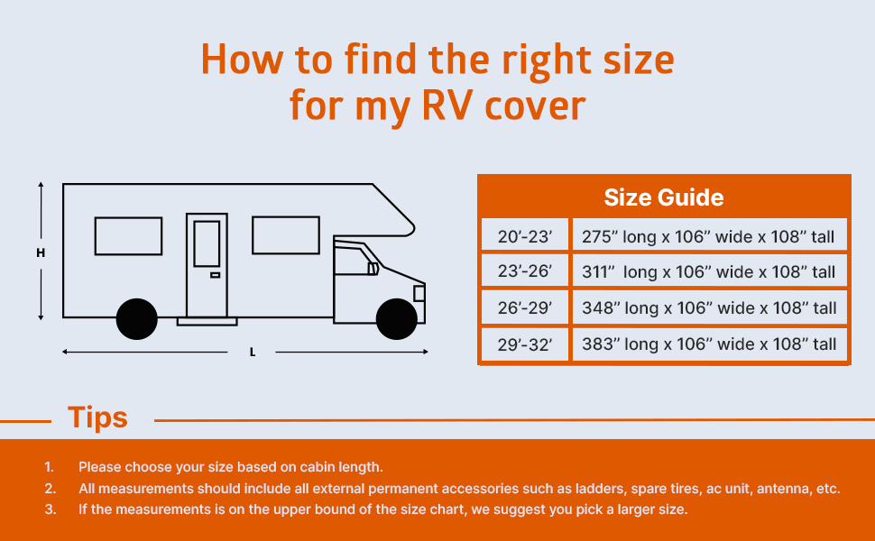 - 【WINDPROOF & SECURE FIT】A total of 8 webbing straps attached to the RV cover provides better protection against the wind. The additional 2 straps are specially designed to better protect the cover from blowing away and tearing in high winds; elastic hem corners, and adjustable front and rear tension plates provide a custom fit.
