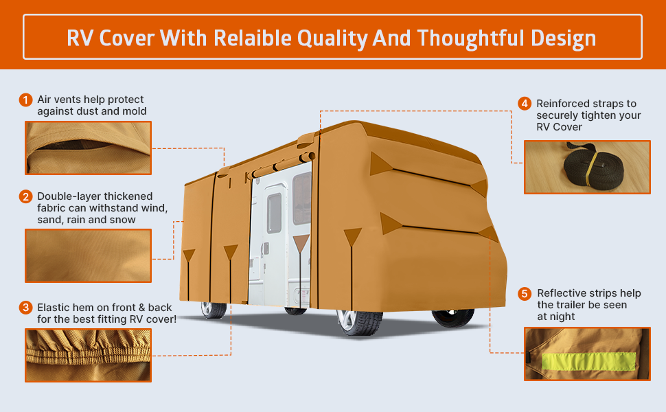 - 【VENTILATION& BREATHABLE】Multiple air vents reduce wind stress, breathable material allows maximum evaporation of water under the cover, prolongs the service life, and helps against mold & mildew. Say bye to stinky RV covers!